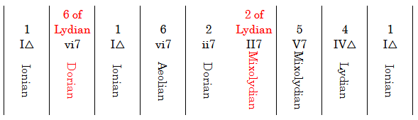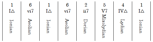 The second progression adds in some of the Lydian mode. The first change is when Dorian is substituted in place of Aeolian. Both modes use a m7 chord, so the harmony remains the same. The change is on the ♭6 of Aeolian. Dorian has a ♮6, so using that changes the tonality and tension for brief moment. We’ll get more into tension soon.
