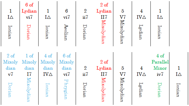 Below is the same progression as before, but with a second movement. This time we take a quick detour through Mixolydian to use a Dorian 5 chord, Mixolydian 1 chord, and an Ionian 4 chord. This makes the 4 chord feel like its 1, but hang on as we move into a Phrygian 6 chord that is still a m7. That still moves perfectly to a Dorian 2 chord from our main Major Scale. We then repeat the end of the first progression with a little twist. Instead of a standard 4 chord to 1 chord to mellow things out, we take a 4 chord in Lydian and briefly modify it to be a m7 Dorian chord. This is where our parallel Minor Scale comes in. This takes a mellow 4 to 1 and turns it into a “minor 4” to 1 and adds an extra layer of mellow on top of mellow. It’s like having a campfire on a cold day and then adding in a fuzzy blanket.
