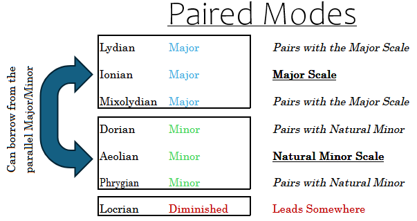 #3: Major modes work with the Major Scale, which can borrow from Natural Minor. Minor modes work with the Natural Minor Scale, which can borrow from the Major Scale. Locrian is tension and directing your ear toward another mode.