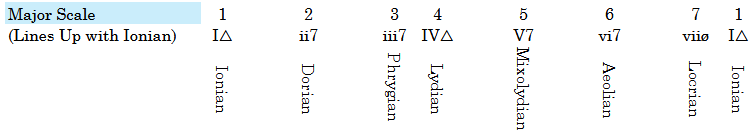Instead of calling Ionian by that name, I’ll call it the Major Scale because we will be using that scale as the primary scale for all three modes. In other words, “THE MAJOR SCALE” is the framework for what we play in any “Major Context”. Lydian, Ionian, and Mixolydian are modes we can turn to that all line up with the Major Scale because they use the degrees 1, 3, and 5. The remaining degrees are what helps us shape our sound as we construct a song. So the Major Scale is the frame, and the three modes are pallets of color.