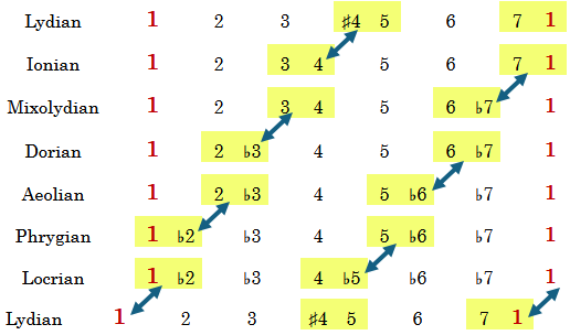 But that’s not what makes modes special. I’ve organized the above chart so that Lydian with its ♯4 or “raised 4th” is above Ionian, while Mixolydian with a ♭7 or “lowered 7th” is below Ionian. This is how you should be organizing modes, because it connects key changes in a variety of ways.