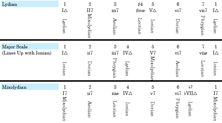 Above I have the three major modes: Lydian, Ionian, and Mixolydian. Each has their degree numbers, roman numerals for tetra chords (4 note chords), and relative modes associated with each degree with the major modes.