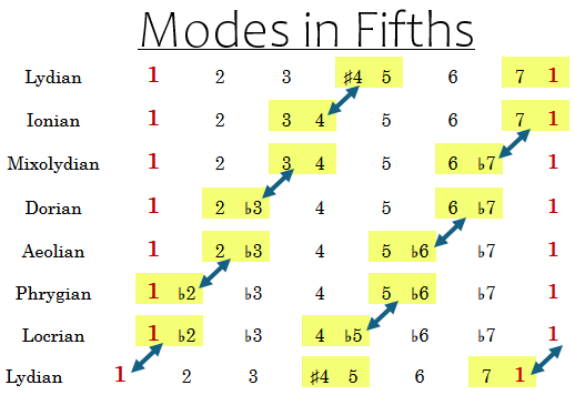 #2: Learning your modes in “fifths” along with their degree formulas gives you access to key changes and modal movements.